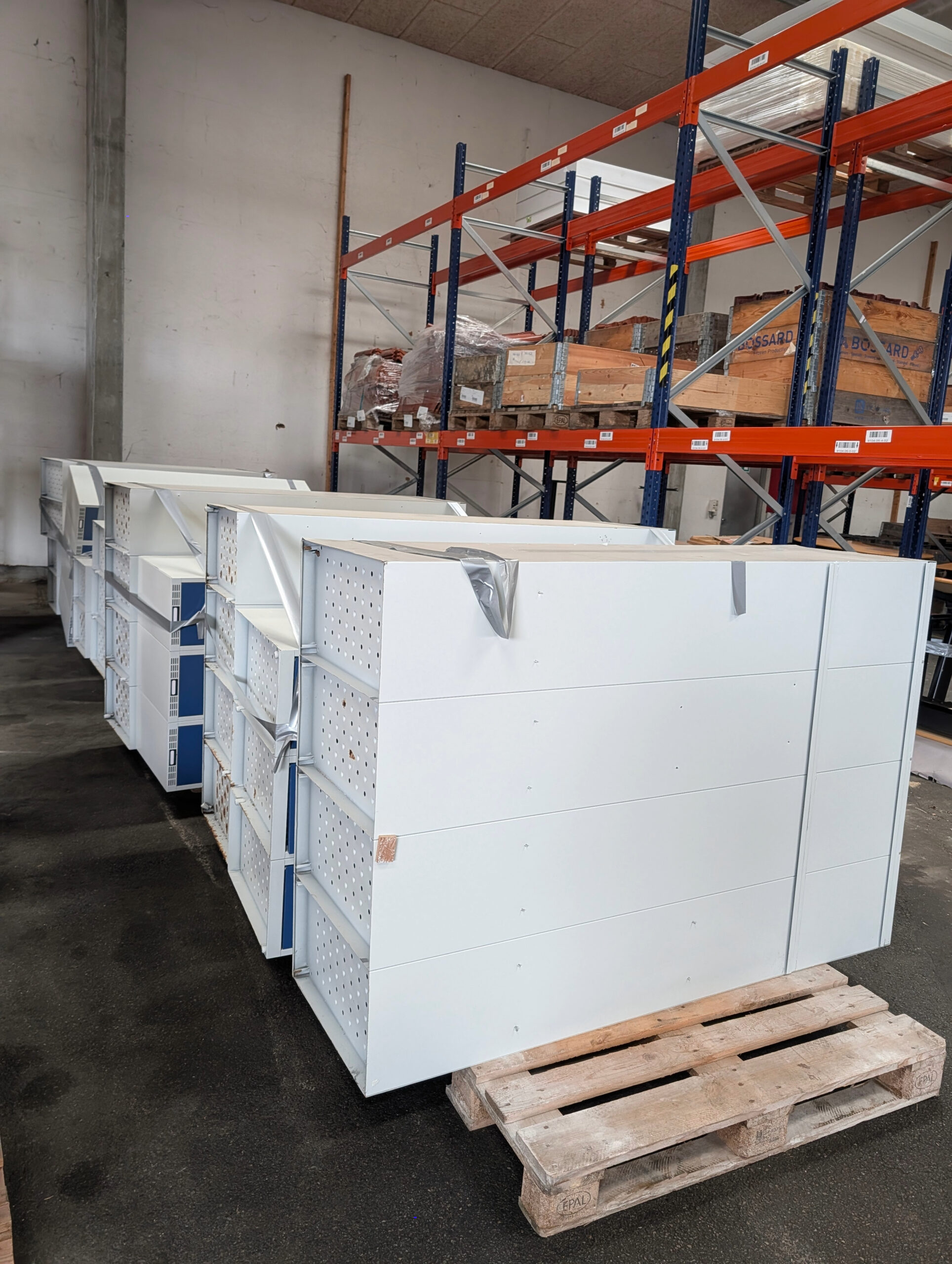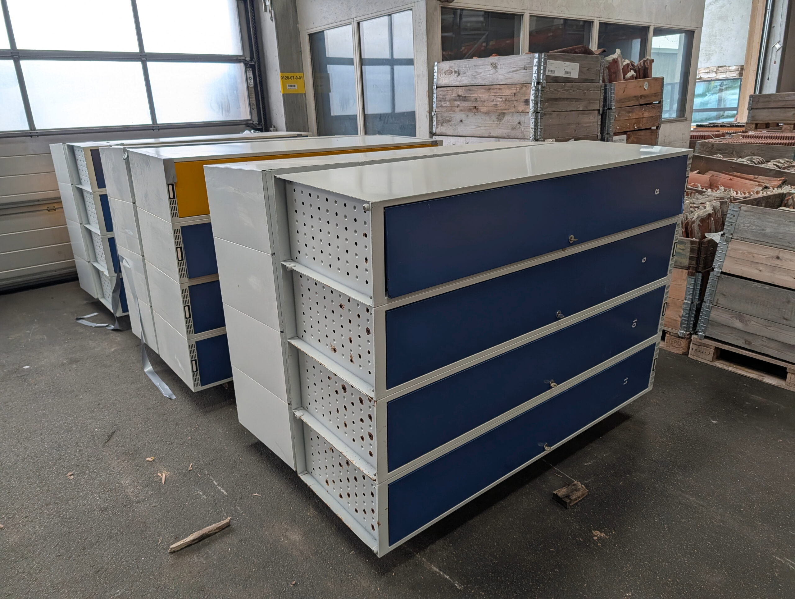 Vi har flere forskellige slags – nogle med bænk, nogle blå, nogle hvide, nogle med dobbelt Z-låger, nogle med låse …